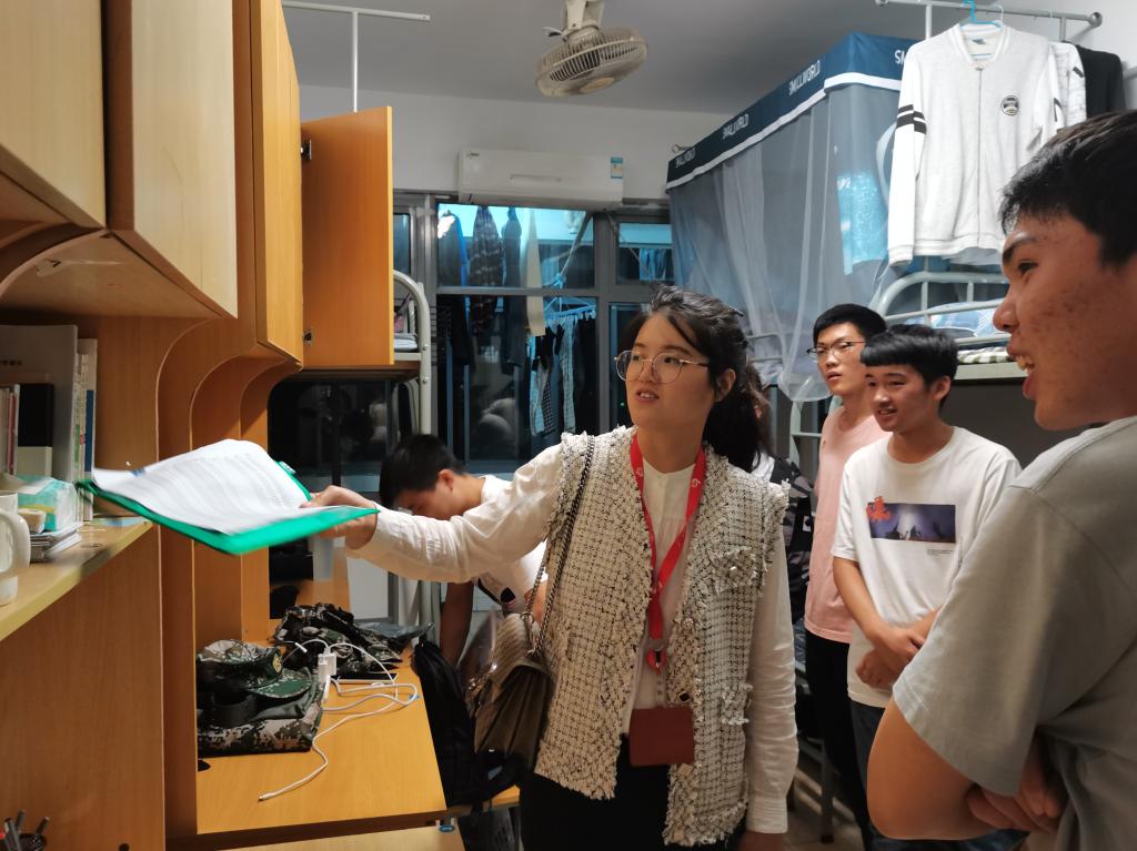 大学生军事训练是国防教育的重要组成部分,为给新生提前树立内务整洁意识,10月11日晚,best365网页版登录官方网站组织了一次内务检查与指导活动,2020级辅导员潘智琦、退伍老兵杨飞龙、部分班主任在各副班的陪同下深入新生宿舍。