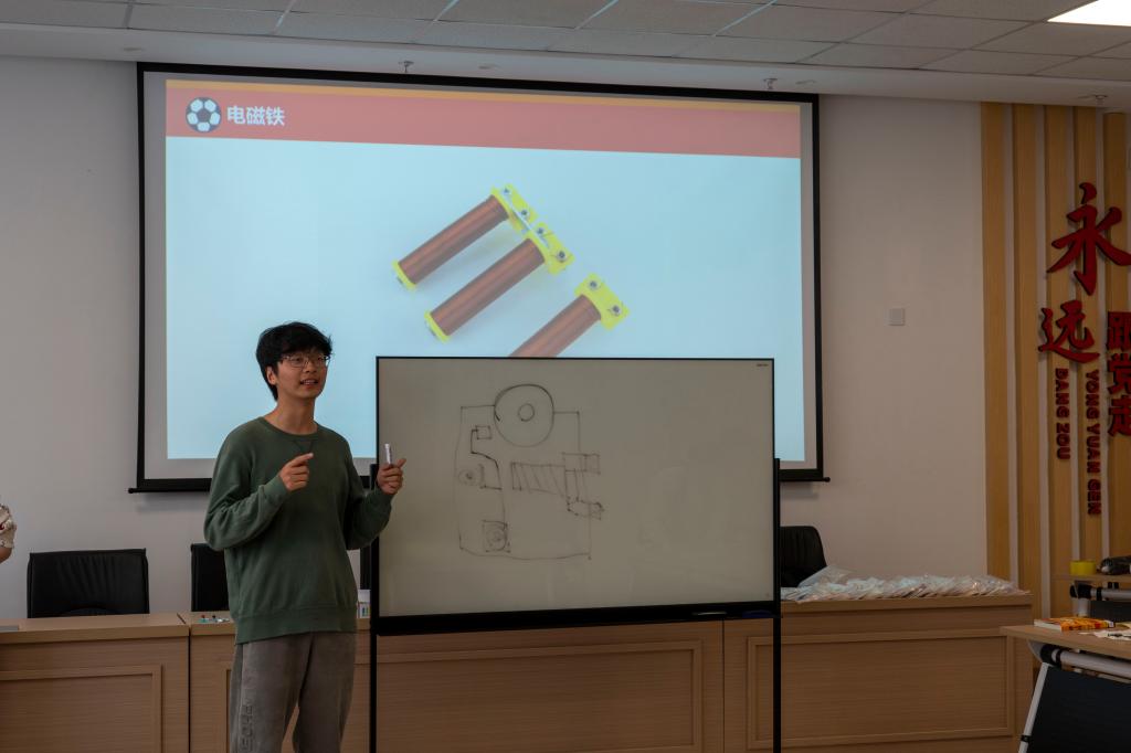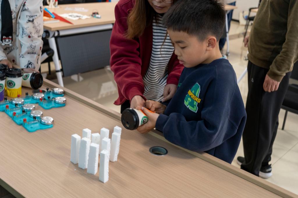 主讲人润斐设计了“电铃小实验”。他通过简单的组件拼装和导线连接就让清脆的电铃声响起,引得现场小朋友惊呼连连。之后,通过更细致地演示讲解,帮助小朋友理解现实中的电路原理。小朋友们在团队成员的指导下完成了电铃的组装,会议室里电铃声起伏。