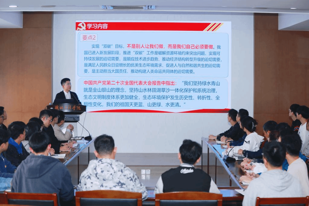 首先是理论学习。与会同志进行了《习近平谈治国理政》第四卷中《实现“双碳”目标是一场广泛而深刻的变革》的原文学习。官俊和受邀前来的教师党支部书记纪小刚教授、学生党员崔辰晖进行了领学。官俊结合党的二十大报告中关于生态文明建设的部分论述,领学了“实现碳达峰、碳中和目标的重要意义”部分内容;纪小刚领学了“实现‘双碳’目标需提高战略思维能力,处理好发展与减排、整体和局部、长远目标与短期目标、政府和市场四对关系”部分内容,并结合国家新能源产业布局、学院学科发展前景进行交流分享;崔辰晖领学了“国家推动实现‘双碳’目标的具体政策,包括加强统筹协调、推动能源革命、推进产业优化升级、加快绿色低碳科技革命、完善绿色低碳政策体系、积极参与和引领全球气候治理六个方面”部分内容。学生党员陆杨进行重点发言,说,通过今天的原文学习更加理解了实现“双碳”目标的重要意义,表示要努力培养创新精神,将所学专业知识应用到产业技术创新中,助力“双碳”目标的实现。学生党员方久康、牛云腾等进行了交流发言。