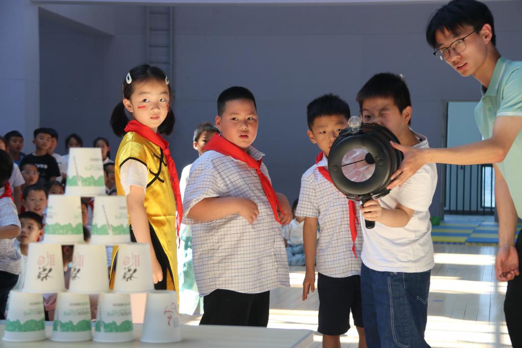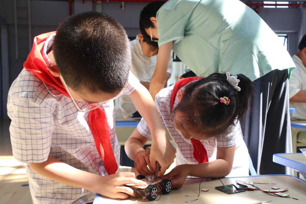 作品展示环节,主讲人生动地为小朋友们讲解了机器人编程与简易机器人设计的原理,机甲大师灵活跟随、物流机器人高效投放、采椒机器人精准采摘,小朋友们在互动环节争先举手回答问题,现场氛围十分热烈。科普实验环节,主讲人首先带来“小苏打遇到白醋”的化学实验。小苏打中的碳酸氢钠和白醋中的醋酸产生化学反应,产生二氧化碳,使气球鼓起来。小朋友们直呼“太神奇了”。主讲人通过单机小马达实验向大家揭秘了电与磁的奥秘。现场设置了隔空击物比拼,使小朋友们动手体验到“空气炮”中蕴含的有趣的伯努利原理。太阳能小车实验环节,小朋友们在志愿者的协助下亲自动手组装,在实践中学习到了太阳能的工作原理和应用价值。小朋友们在科普实验环节不仅收获了科学知识,更感受到了科学探索的乐趣。