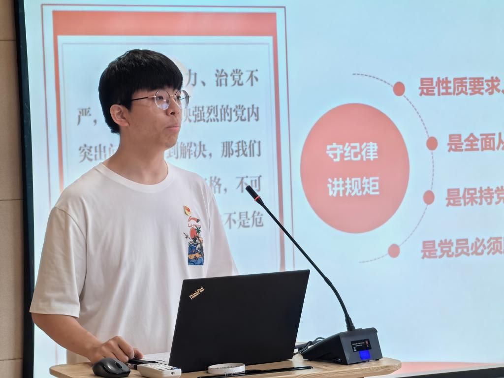 先进制造研究中心研究生第三党支部书记张权带来《守党纪、强党性、践初心》主题教育微党课,从党的发展历程中理解党纪学习教育的重要意义,梳理解读《中国共产党纪律处分条例》,引导新党员学纪、知纪、明纪、守纪。